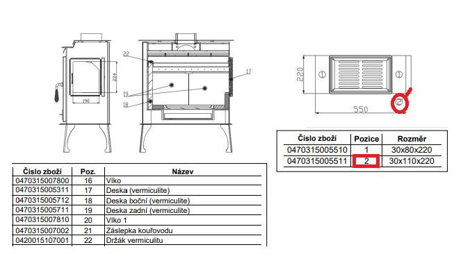Objednávkový kod - starý - 470315005511 pro položku Cihla (šamot) 30x110x220 ------------ Počet potřebných kusů do kamen nebo krbu : 1