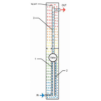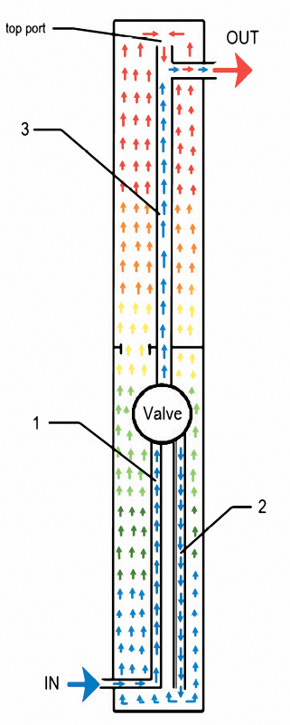 Studená voda do solární sprchy vstupuje napájecím ventilem označeným jako VSTUP. Pokud chcete užít teplouv vodu, dejte pákovou baterii do pozice "TEPLÁ" (označeno červenou barvou). V této pozici proudí vstupní studená voda potrubím č.1 a č.2 přes ventil č.5. Potrubí č.3 je nyní zavřené. Studená voda proudí otevřeným prostorem solární sprchy, který je zahříván slunečním zářením. Voda proudí od spodní části sprchy k vrchu a mísí se s již zahřátou vodou. Do ústí VÝSTUP vstupuje skrz otevřenou bránu č. 4.